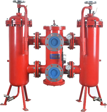 它的工作特點(diǎn)是當(dāng)一只過(guò)濾器濾芯堵塞需要更換時(shí),不需要停止主機(jī)工作,只要打開(kāi)壓力平衡并轉(zhuǎn)動(dòng)換向閥,另一只過(guò)濾器即可參加工作,然后更換已堵塞的濾芯。