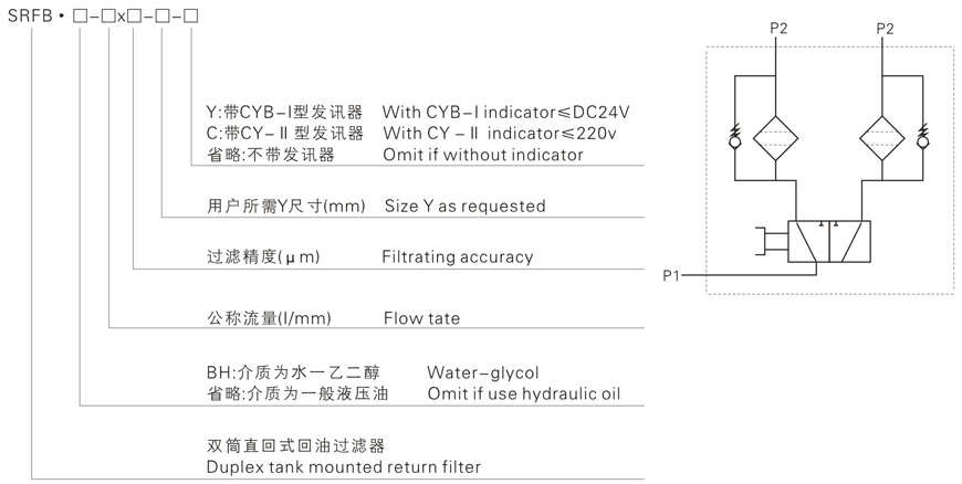 注:*為過濾精度,若使用介質(zhì)為水一乙二醇帶CYB-Ⅰ發(fā)訊器,則過濾器型號為:SRFB·BH-63×*-Y,濾芯型號為SFBX·BH-63×*.