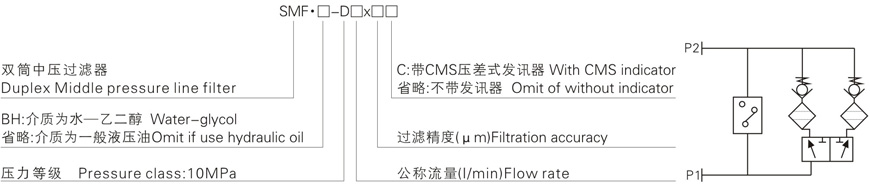 注:*為過(guò)濾精度,若使用介質(zhì)為水一乙二醇,使用壓力10MPa,公稱流量100L/min,過(guò)濾精度10μm,帶發(fā)訊器。則過(guò)器型號(hào)為SMF·BH-D100×1 0c。濾芯型號(hào)為L(zhǎng)H0160D010BN3HC。
