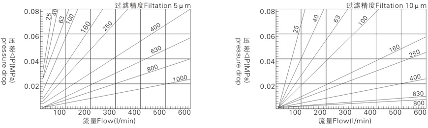 濾芯FAX-※ x ※ (由試驗(yàn)測(cè)得數(shù)據(jù))Q-△P 曲線油液粘度