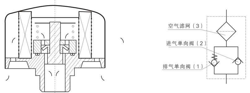 PAF系列產(chǎn)品適用于工程機(jī)械、車輛、移動機(jī)械以及需要具有壓力的液壓系統(tǒng)油箱配套使用。本產(chǎn)品由空氣過濾器、進(jìn)氣單向閥、排氣單向閥、加油過濾器四部分組成,從而簡化了油箱的結(jié)構(gòu),又有利于油液的凈化。當(dāng)液壓系統(tǒng)工作時油箱內(nèi)的液面不時上升或下降,下降時PAF產(chǎn)品吸入空氣,經(jīng)過濾網(wǎng)[3]自動進(jìn)入進(jìn)氣單向閥[2],進(jìn)入油箱,此時箱內(nèi)壓力小于預(yù)定壓力,排氣單向閥[1]處于關(guān)閉狀態(tài),能保持油箱內(nèi)預(yù)定壓力,提高油泵的自吸能力,維持油箱內(nèi)液體的平穩(wěn),避免油箱內(nèi)液體因振蕩或騷動而產(chǎn)生泵可能出現(xiàn)的吸空等故障。當(dāng)工作循環(huán)后流回油箱使液面上升,工作油液溫度也隨著升高,生成了油霧氣體并增加了油箱內(nèi)的壓力;當(dāng)油箱內(nèi)的壓力大于預(yù)定壓力時,排氣單向閥[1]自動開啟向外排氣,直到箱內(nèi)壓力等于預(yù)定壓力時,排氣單向閥[1]才自動關(guān)閉。這樣來回循環(huán)既能保護(hù)液壓系統(tǒng)正常工作的作用,又能延長油液及元件周期和使用壽命。